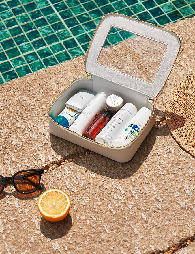 - [Premium Material and Durability] – The clear cosmetic cass, both the exterior and interior, is crafted from high-grade saffiano faux leather, which is highly scratch resistant, durable and exceptionally easy to keep clean. It features a smooth zipper for secure closure, and elegant light gold metal hardware accents, adding a luxurious and sophisticated touch to the bag's overall design.