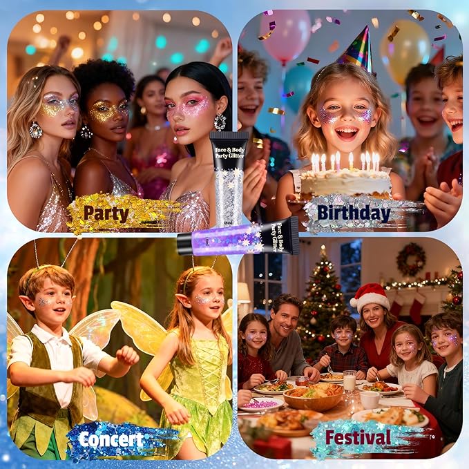 - 【PARTY RAVE FESTIVAL FOR WOMEN】: From creating a stunning mermaid scale effect at a festival to adding disco-ready sparkle to your hair, this face glitter for women is your ultimate companion. Perfect for parties, performances, and photoshoots. Plus, it’s fantastic for DIY projects—decorate phone cases, artwork, or accessories and let your creativity shine