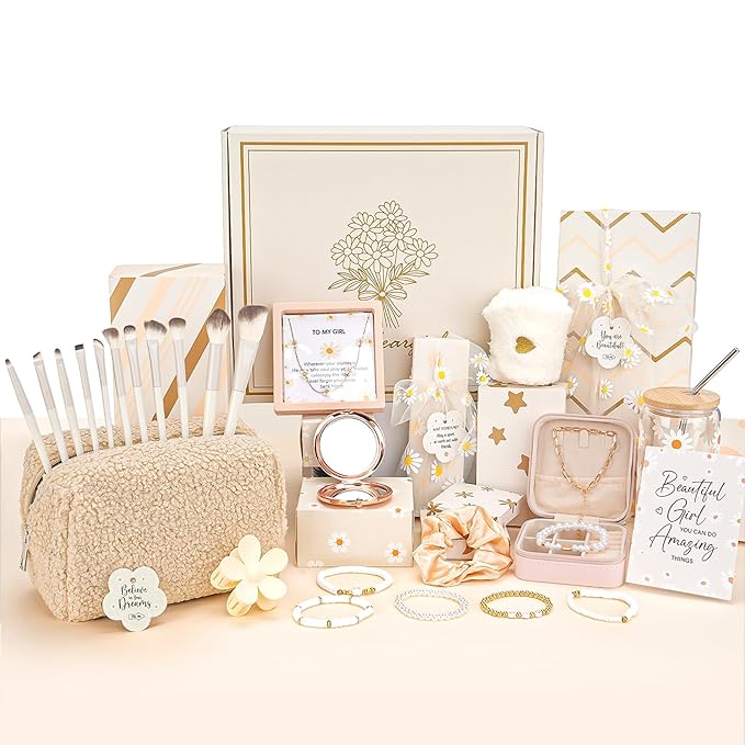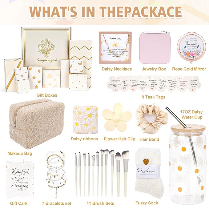 - 【9 Individually Wrapped Premium Gifts】- We have carefully selected 9 trendy and practical items, all packed in a high-end gift box. Includes 11 makeup brushes, a stylish jewelry box, 7 handmade fashion bracelets, a daisy necklace symbolizing love, a plush makeup pouch, a rose gold mirror, cozy plush socks, a daisy-themed cup, and cute hair clips and ties. Also includes empowerment task cards, daisy ribbons, and a greeting card, each conveying love and encouragement.