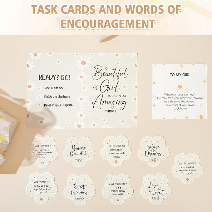 - 【Empowering Task Cards】- The gift set contains 9 thoughtfully designed task cards, each featuring a fun challenge and a warm message. We recommend she completes each card before unwrapping the corresponding gift. This interactive ritual is designed to foster confidence and growth while delivering your love and encouragement.