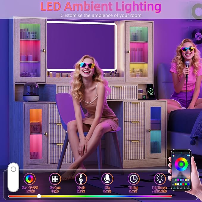 - RGB Ambient Lighting Design – Transform your bedroom into a stylish beauty corner with adjustable RGB cabinet lighting. The soft glow through the fluted acrylic doors creates a dreamy ambiance, perfect for relaxing evenings or adding flair to your room décor. Beyond storage, this vanity doubles as a statement piece that elevates the entire atmosphere of your space.