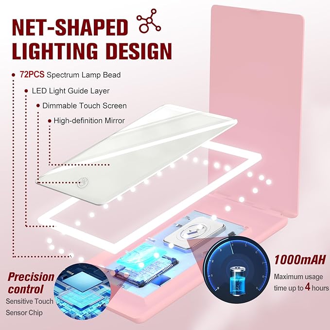 Travel Makeup Mirror with Lights, Rechargeable Portable Folding Compact Mirror Set with Tweezer, Lighted Makeup Mirror with 72 LED 3 Color Light Modes, Dimmable Touch Screen LED Mirrors-Pink