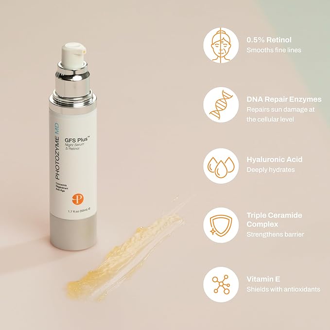Photozyme GFS Plus Night Serum with 0.5% Retinol – Anti-Aging Peptide Complex – Reduces Wrinkles, Dark Spots & Sun Damage – Brightens, Firms & Evens Skin Tone – 0.5 fl oz